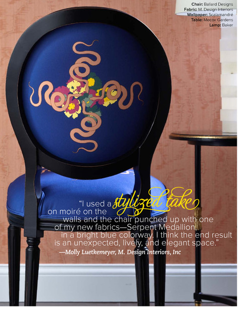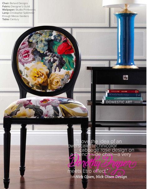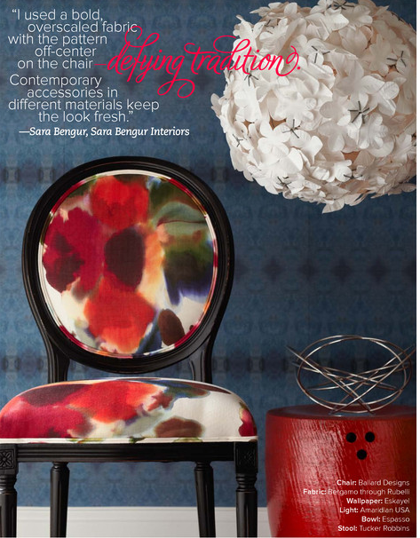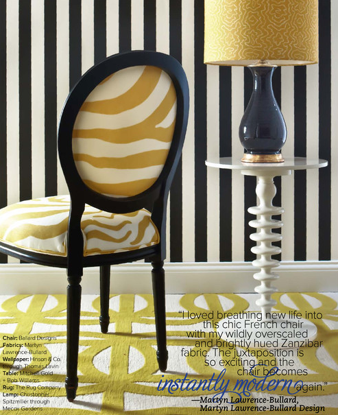 “I loved breathing new life into this chic French Chair with my wildly overscaled and brightly hued Zanzibar fabric. the juxtaposition is so exciting and the chair becomes instantly modern again.”-Martyn Lawrence- Bullard Design