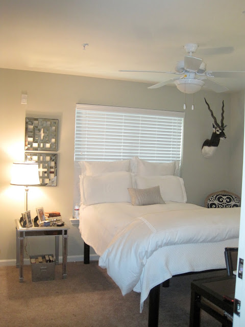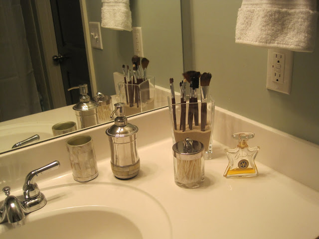 I'll take credit for " inspiring you " back into blogging! Or was it "guilting you?! But the room is all YOU!! I love the white — using it myself, along with the mirrored nightstand!! And I have to copy the make up brushes — so sensible! I love the simple lines, even of the freebie furniture…you have really made it work!! Any desire for curtains?? I would love a project… If so, send pictures of what you like.